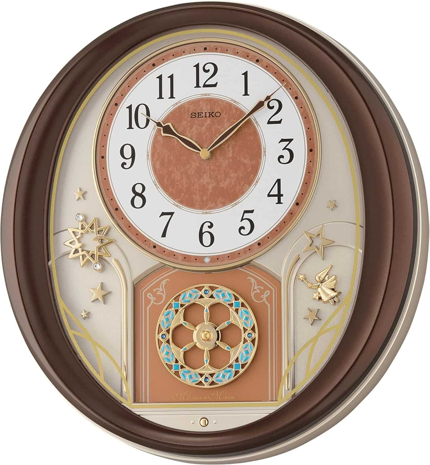 Seiko’s Melodies in Motion Clocks are enchanting and magical. This clock, Warm Summer Night Melodies in Motion, brings a warm summer night to life. The one way rotating pendulum will delight everyone as it turns and plays one of eighteen of the finest quality sound melodies or Westminster chimes. It has a brown case, a demonstration button, and volume control. This clock is enclosed in glass, the pendulum features Swarovski crystals, and an off/on switch. This clock will light up your house year-round.